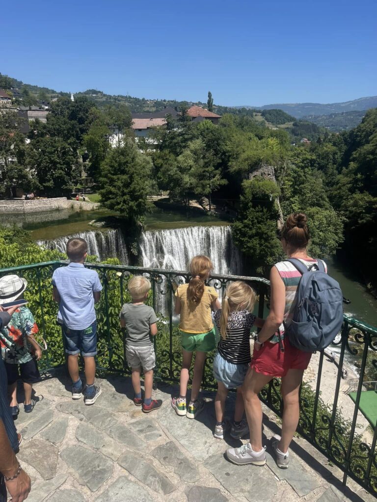 En wat vertrokken we vroeg. Om 3:30 ons bed uit. Dat was niet makkelijk. Maar rond 8 uur zetten we voet aan de grond op een piepklein vliegveldje waar welgeteld 1 vliegtuig stond: die van ons. Vervolgens hebben we geprobeerd ons niet op te laten lichten bij de autoverhuur en zijn we via markt van Banja Luka en de watervallen van Jajce naar ons huisje aan de rivier gereden.